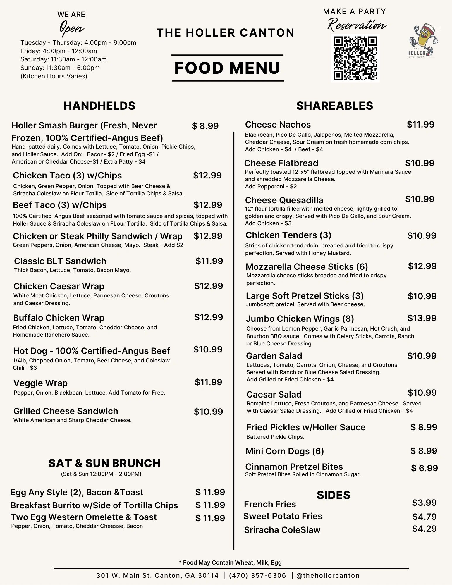 The Holler boasts an impressive selection of 14 craft beers, a curated wine list, and a variety oof premium liquors. Whether you’re a craft beer enthusiast, a wine lover, or prefer a perfectly mixed cocktail, we have something to suit every taste.